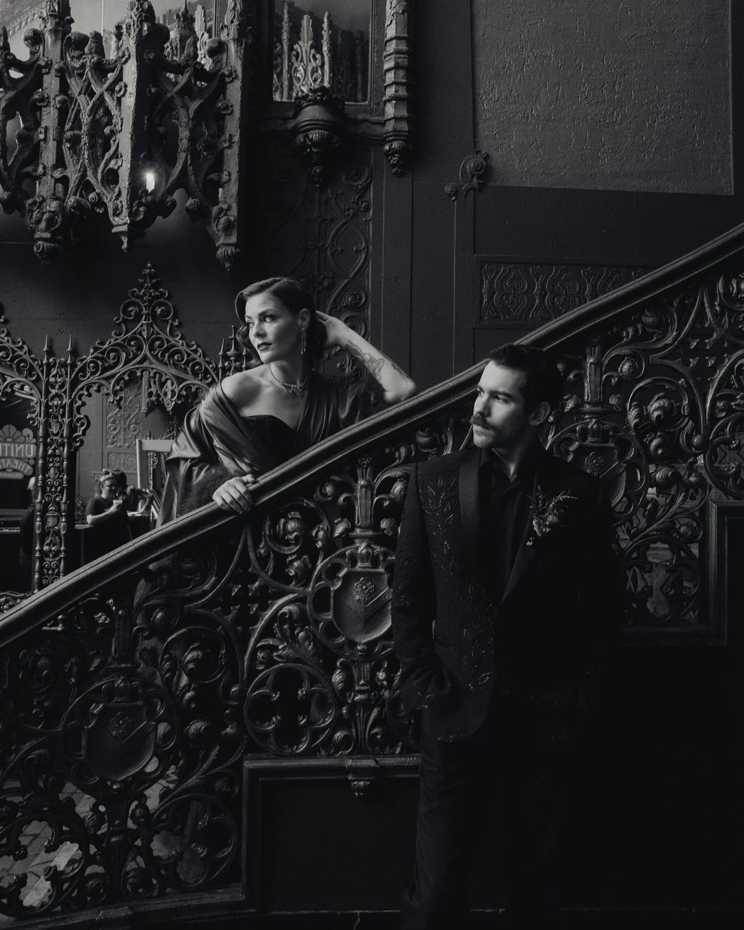 The Classic Staircase: Winding wrought-iron rails and upscale décor add a regal feel to bridal portraits.